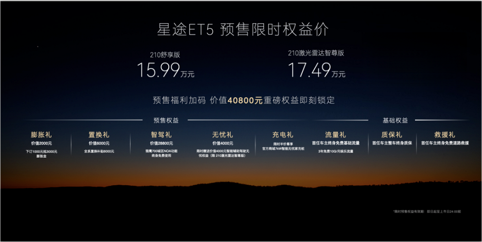 新车预售期间,共推出210舒享版与210激光雷达智尊版两个版型,预售价分别为15.99万元与17.49万元,并推出总价值40800元的加码福利,包括定金膨胀、置换补贴、智驾功能终身免费等,进一步强化其市场竞争力。