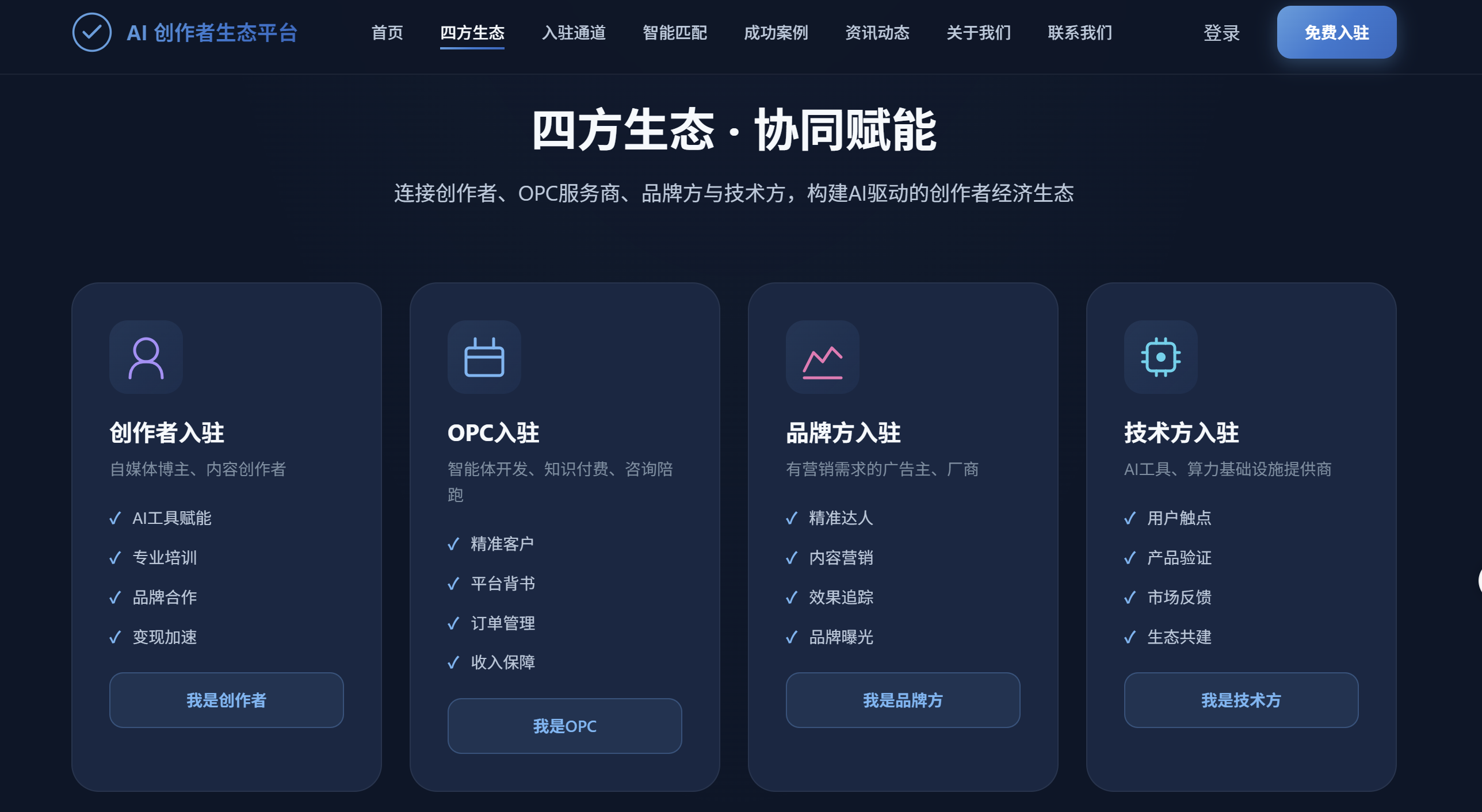 平台最大的创新,在于打破传统单向服务模式,构建四方高度协同的价值循环网络,核心是实现 “AI 大厂 + OPC + 创作者 + 品牌方” 的智能化协同: