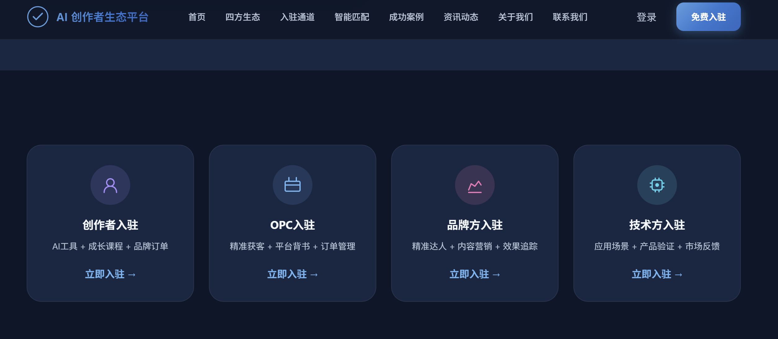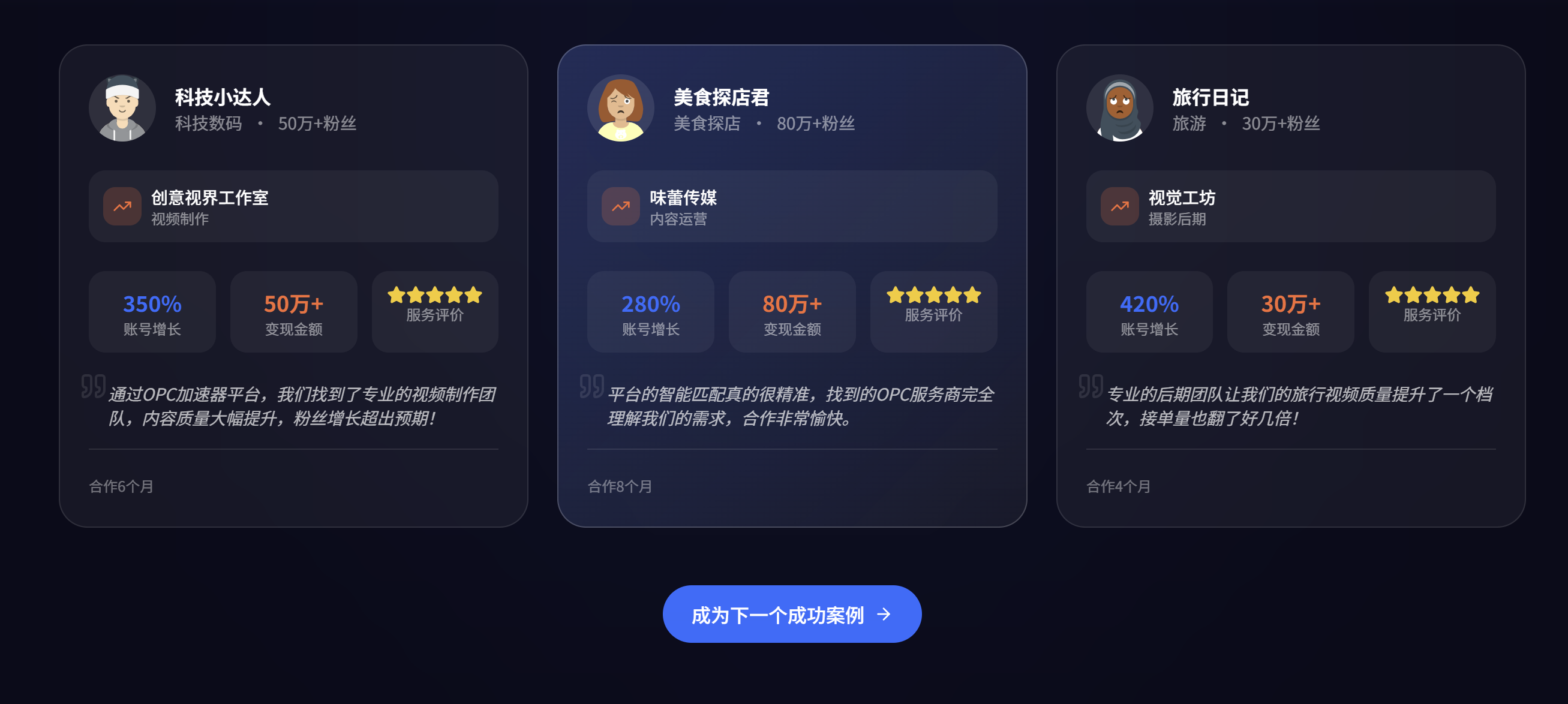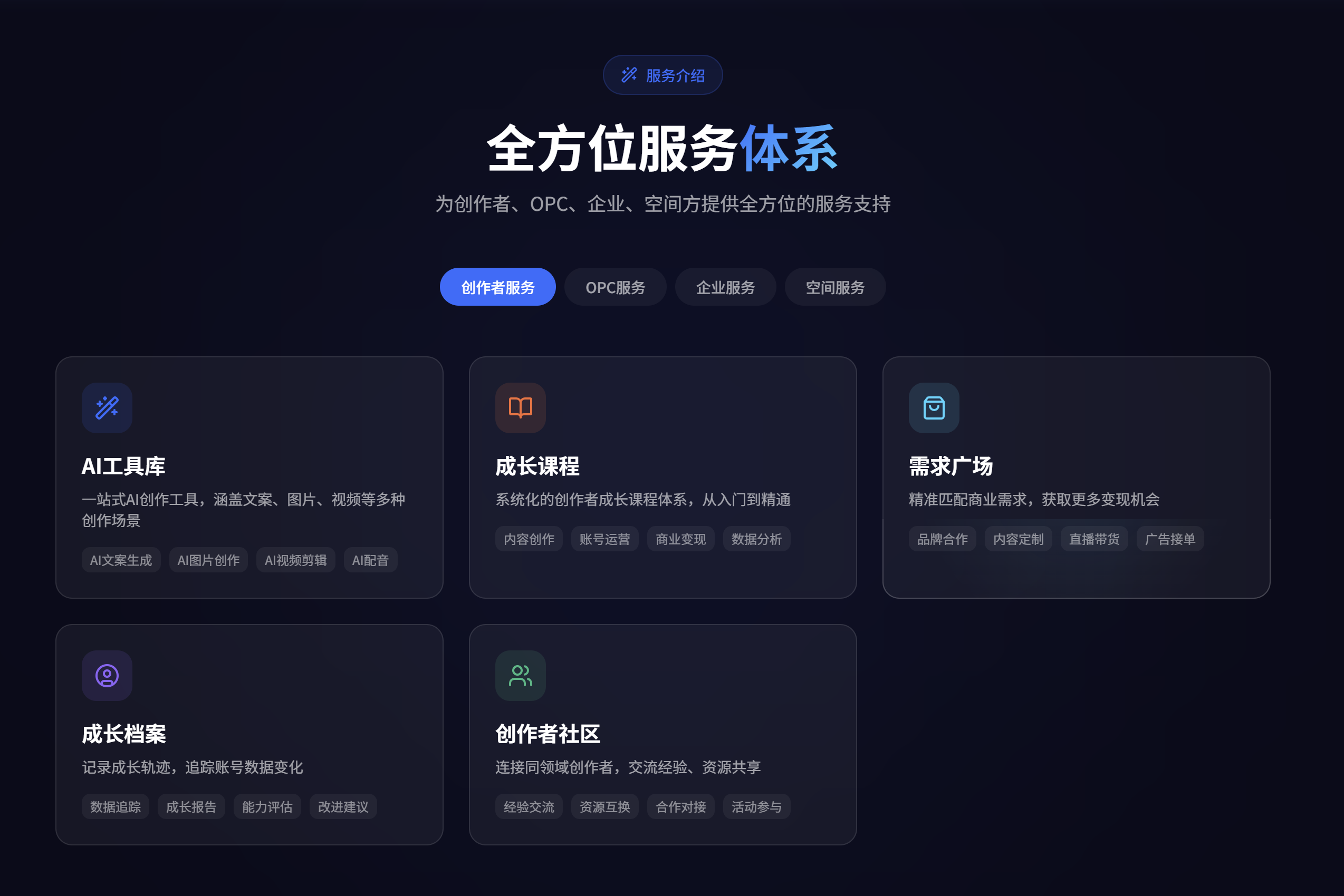 AI+OPC 协同赋能:通过平台 AI 智能匹配,让创作者快速对接适配自身需求的 OPC 服务,借助营销智能体、自动化运营工具等,将 AI 融入选题、创作、运营、变现全工作流,同步获取行业最新技术与方法,消除信息差,真正实现高效创作、轻松变现。