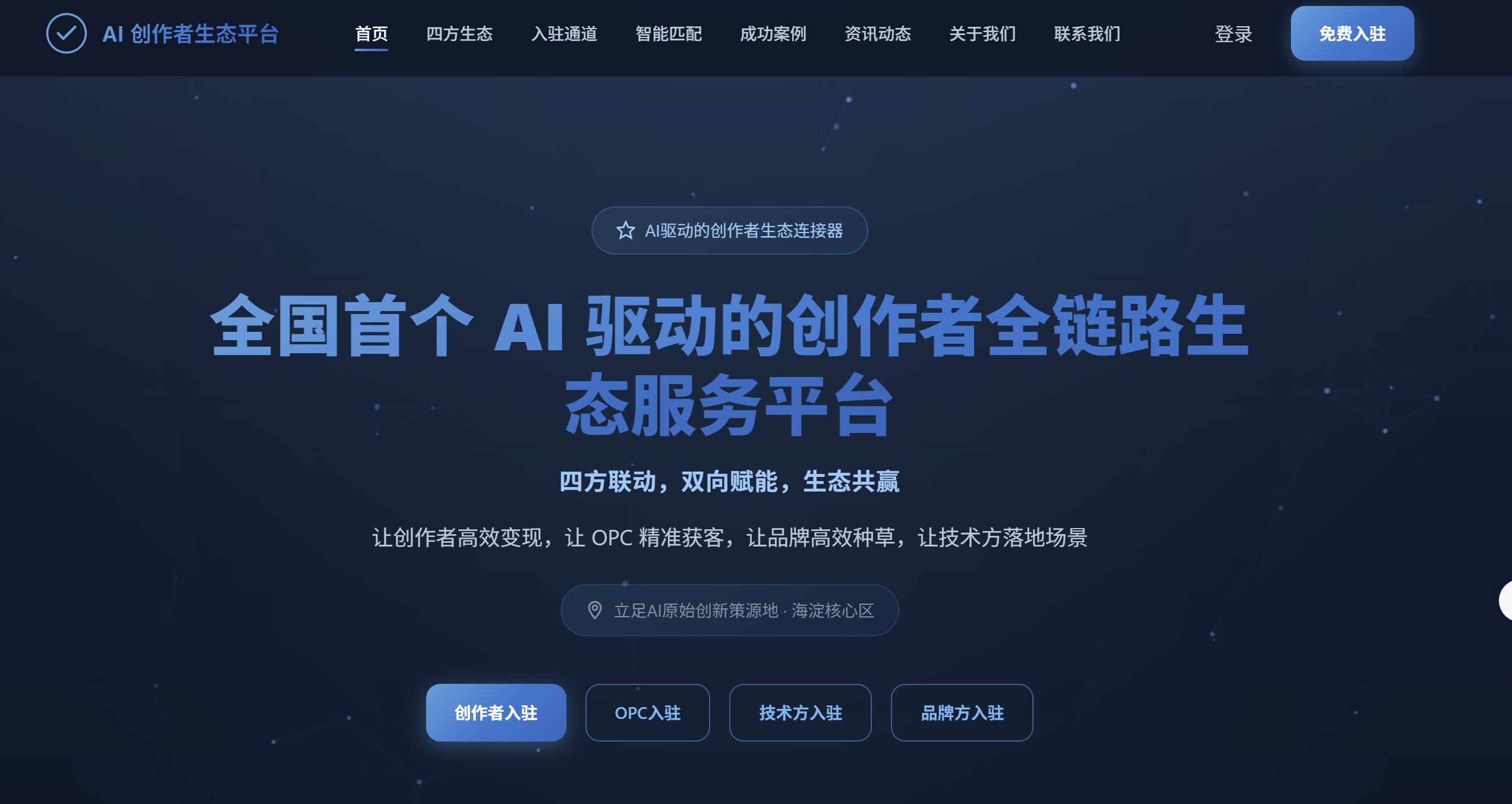依托北京人工智能产业的创新生态与发展优势,全国首个 AI 驱动的创作者全链路生态服务平台概念方案正式对外发布,并同步开放原型展示网站。平台发起人赵方艾介绍,该平台并非传统意义上的工具聚合或接单平台,而是一套系统性打通创作者、服务型 OPC、品牌方、技术方四大核心群体的生态模型,核心是将 AI 真正融入创作者工作流,破解当前行业供需错位、资源孤岛、价值流转低效的深层痛点,最终实现:让创作者高效变现,让 OPC 精准获客,让品牌高效种草,让技术方落地场景,共建可持续的 AI 内容产业新生态。
