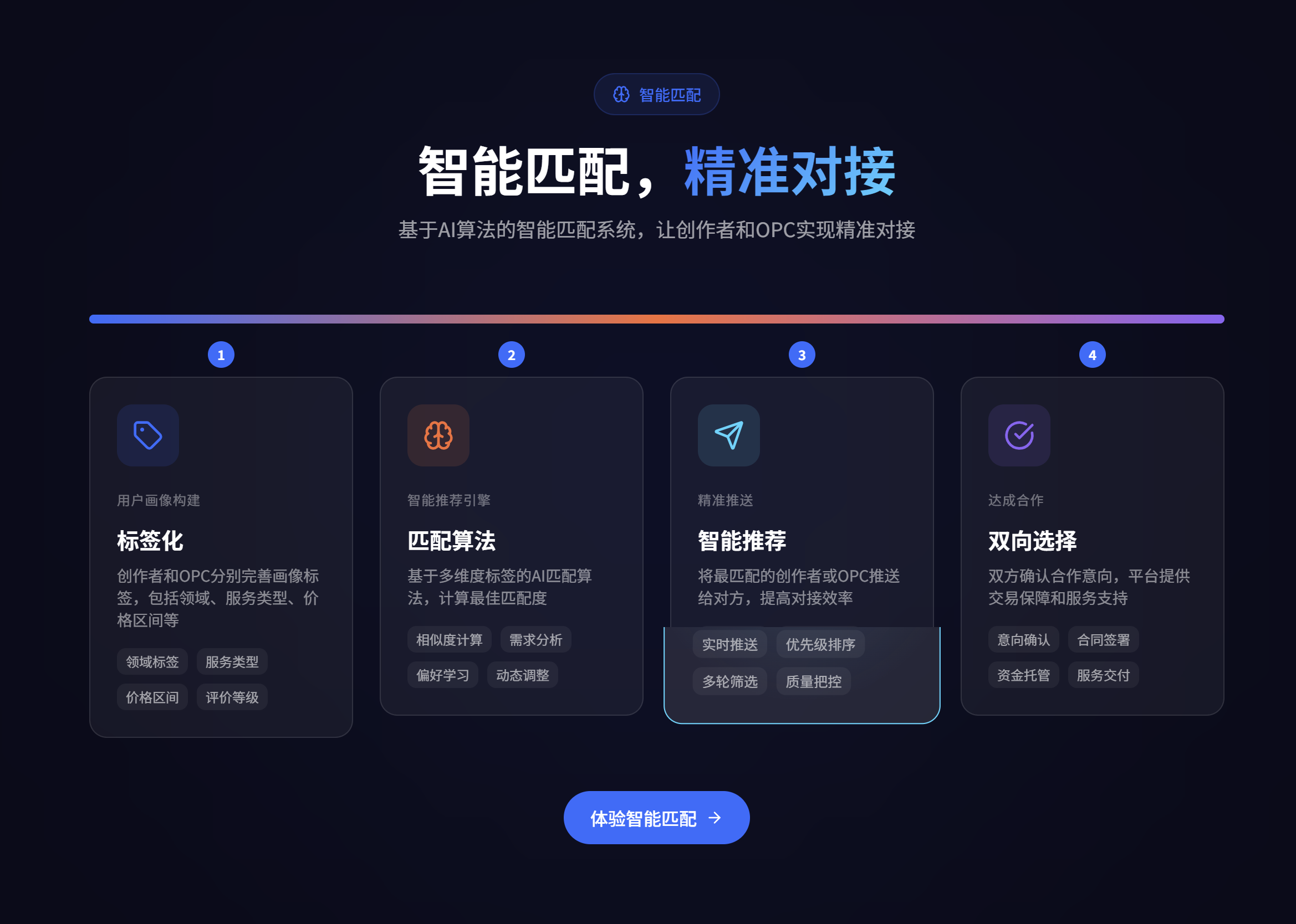 针对 OPC 开发者(行业技术创新活跃力量)普遍面临的 “获客难、信任难、管理难” 痛点,平台通过 AI 智能匹配,打通 OPC 与创作者、品牌方的需求对接通道,提供精准客源匹配、订单管理支撑与生态信用背书,让 OPC 开发者能够专注技术研发、深耕营销智能体等创新服务,摆脱低价内卷: