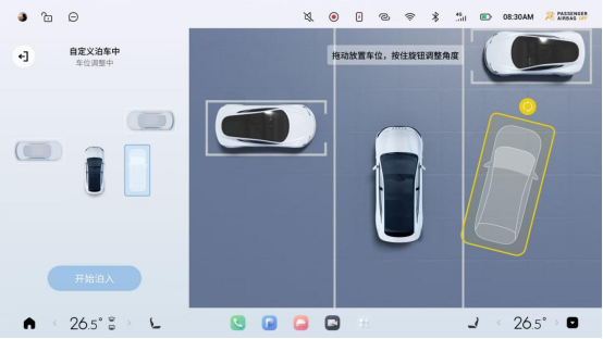 指尖随心泊车辅助赋予用户更高自由度。用户可通过中控屏幕拖拽虚拟车模与车位框,自定义泊车位的位置和角度。此功能适用于老旧小区、露营地等停车区域,帮助用户灵活选择安全停车位置,有效降低刮擦风险,并可通过精细调节确保足够的开门空间(适配:猎鹰500-高速辅助驾驶车型)。