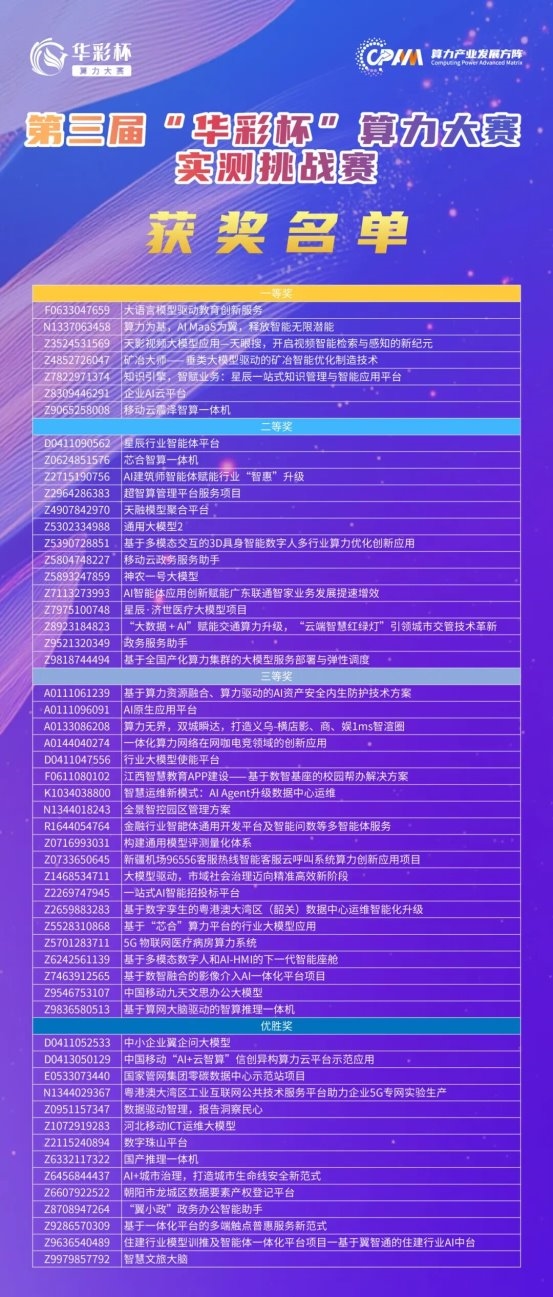 在第三届“华彩杯”算力大赛实测挑战赛中,《大语言模型驱动教育创新服务》《算力为基,Al MaaS为翼,释放智能无限潜能》《天影视频大模型应用——天眼搜,开启视频智能检索与感知的新纪元》等7个项目获得实测挑战赛一等奖,《星辰行业智能体平台》《芯合智算一体机》《AI建筑师智能体赋能行业“智惠”升级》等14个项目获得实测挑战赛二等奖,《基于算力资源融合、算力驱动的AI资产安全内生防护技术方案》《AI原生应用平台》《算力无界,双城瞬达,打造义乌——横店影、商、娱1ms智渲圈》等20个项目获得实测挑战赛三等奖。